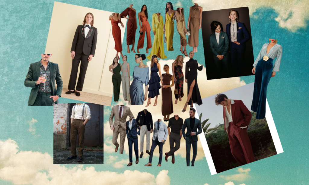 A: Check out the mood board below for some inspiration! Jewel tones are encouraged. Make sure you bring comfortable shoes that are good for walking through grass and uneven terrain.
